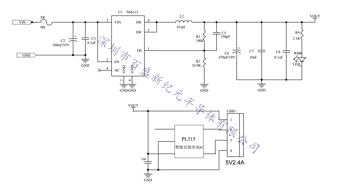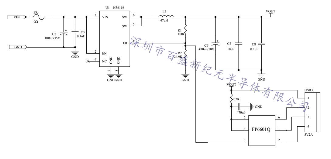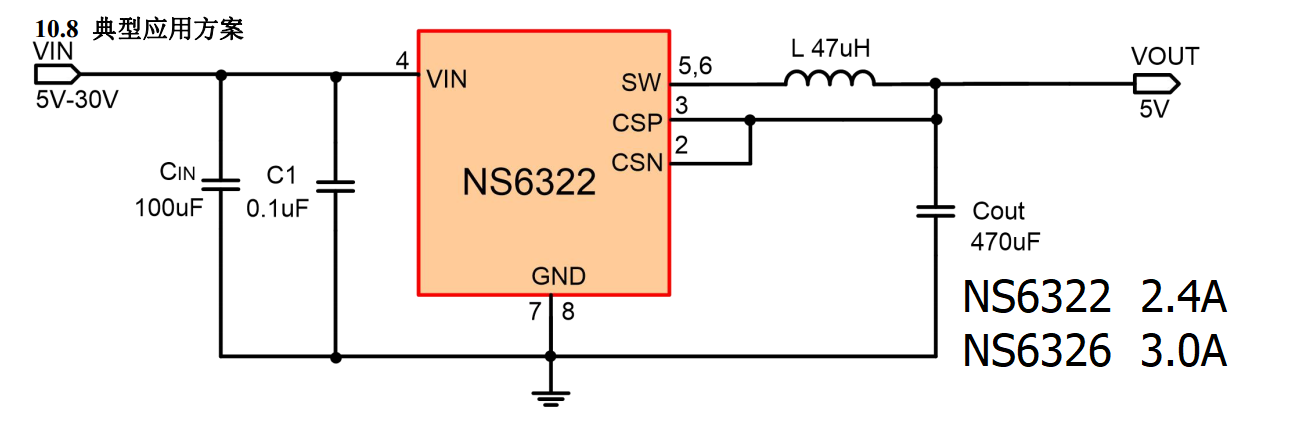 NS6322,固定輸出電壓5V,2.4A可調恒流電流,外圍僅僅電容和電感,高集成,過EMI