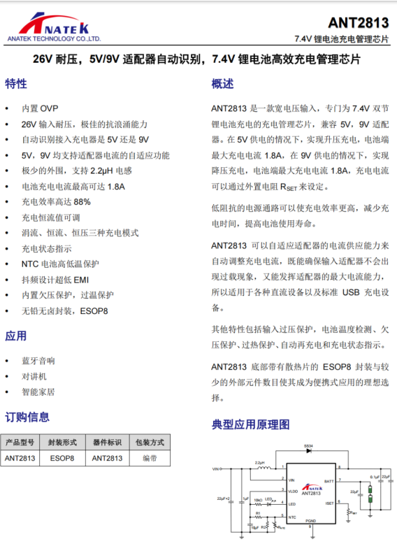 ANT2813 特點:7.4V 鋰電池充電管理芯片,自動識別接入充電器是 5V 還是 9V,充電電流1.8A,耐壓26V, 內置 OVP/NTC功能,用于指紋鎖、對講機、音箱等市場,封裝ESOP-8。