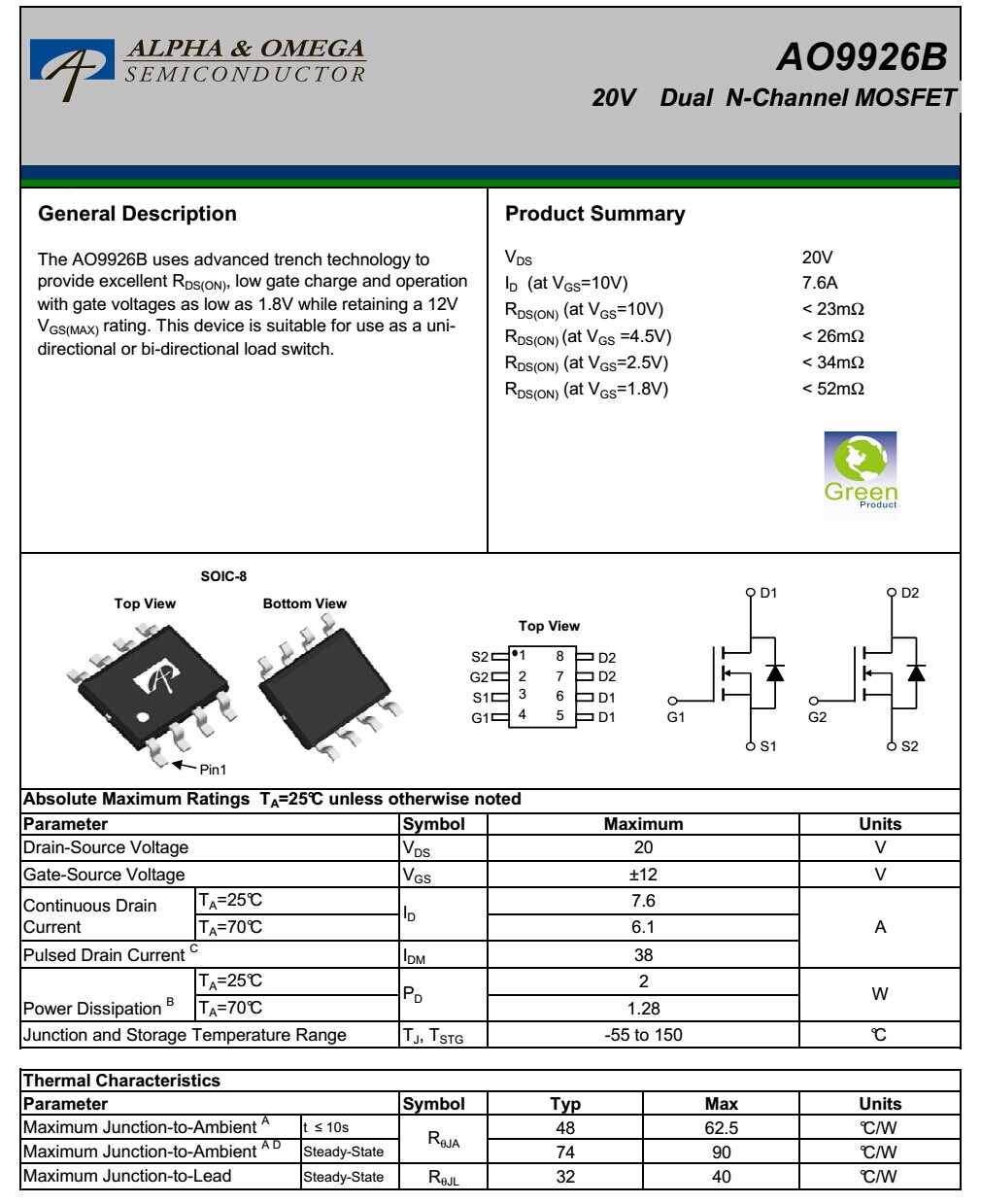 AO9926B雙N溝道MOS管(20V 7.6A)