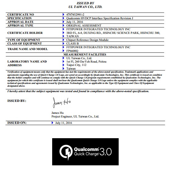 QC3.0高通認證證書-FP6600Q