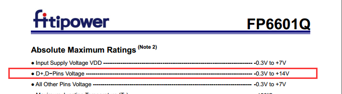 FP6601Q現在針對D+.D-腳的耐壓進行了優化,提高到14V,可保證在VBUS與D-,D+誤觸發或者拔插時,不會造成IC損傷,輸出電壓異常。