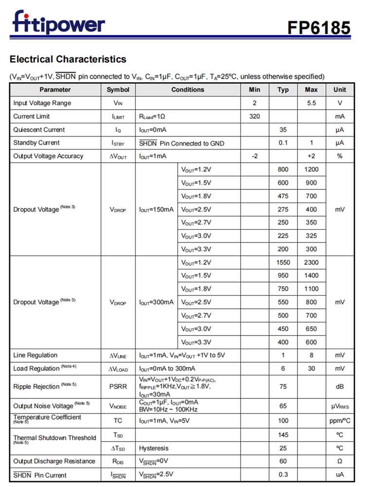 FP6185是一種低輟學、低噪聲、高PSRR、極低靜止電流正線性調節器。FP6185可以提供300 mA輸出電流,約400 mV的低輟學電壓,為電池供電系統或便攜式無線設備進行優化。關機功能可為外部信號提供遠程控制,以決定在關機模式下消耗量小于0.1μA的FP6185的開/關狀態。