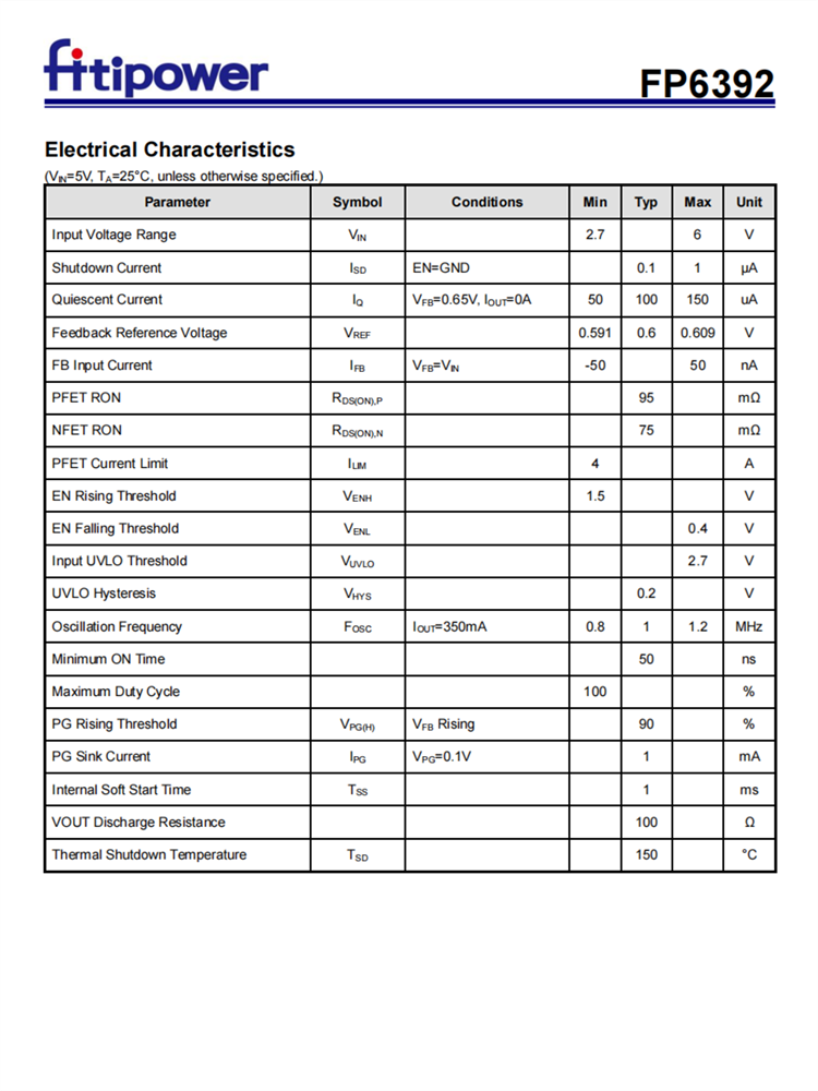 從技術規格來看,FP6392的輸入電壓范圍廣泛,可以從2.7V到6V,使其能夠適應多種不同的電源環境。同時,它具有高達3.5A的輸出電流能力,滿足了高功率應用的需求。此外,通過內部補償功能,FP6392能夠穩定輸出電壓,并提供精確的電壓調節。