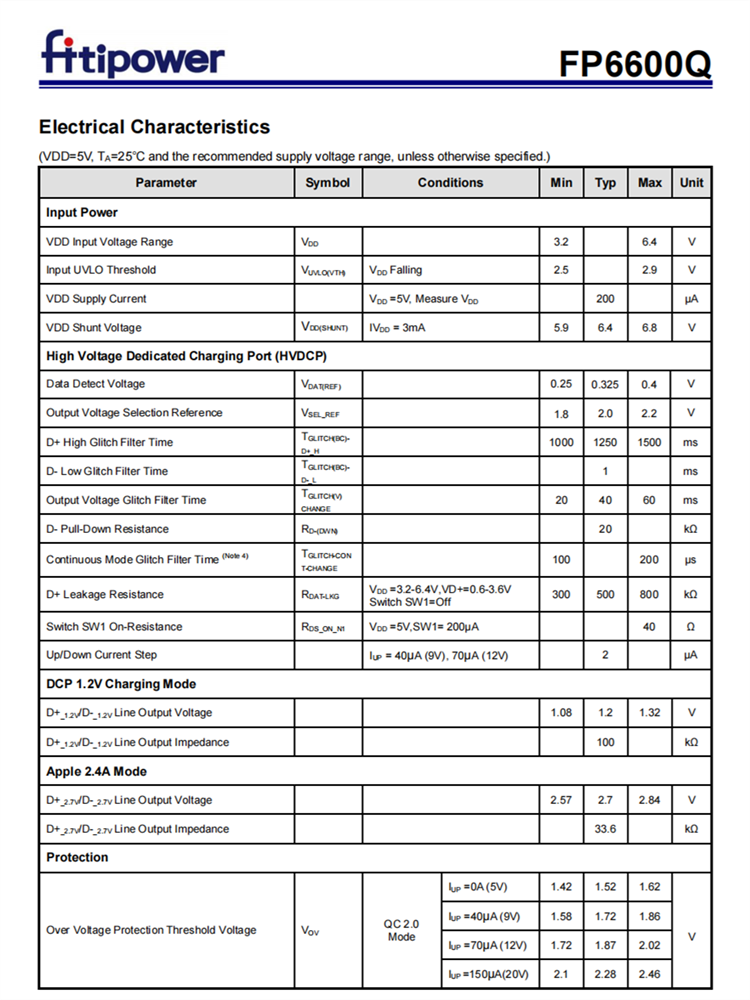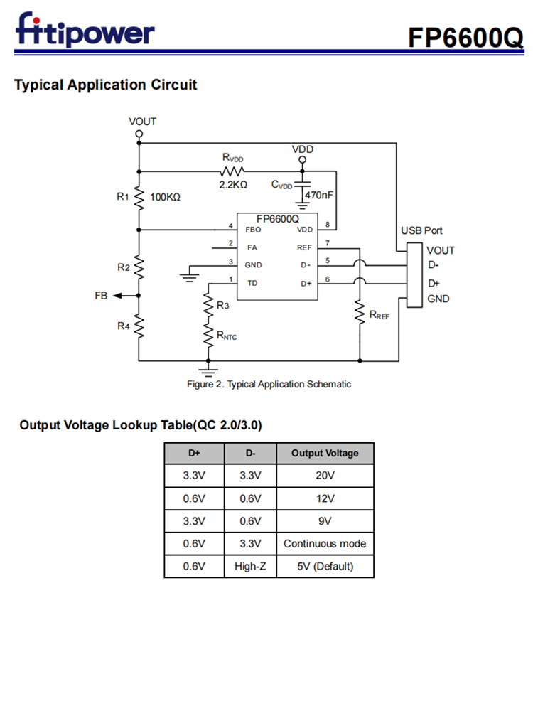 FP6600Q是高通硅快速充電協議(FCP)和高通®快速ChargeTM 2.0/3.0(QC 2.0/3.0)USB接口的快速充電協議控制器。該設備可為FCP或QC 2.0/3.0供電設備(PD)快速充電。該協議功能監控USBD+/D數據線電壓或D數據線傳輸,并自動調整電源組和墻壁適配器的輸出電壓,以優化充電時間。