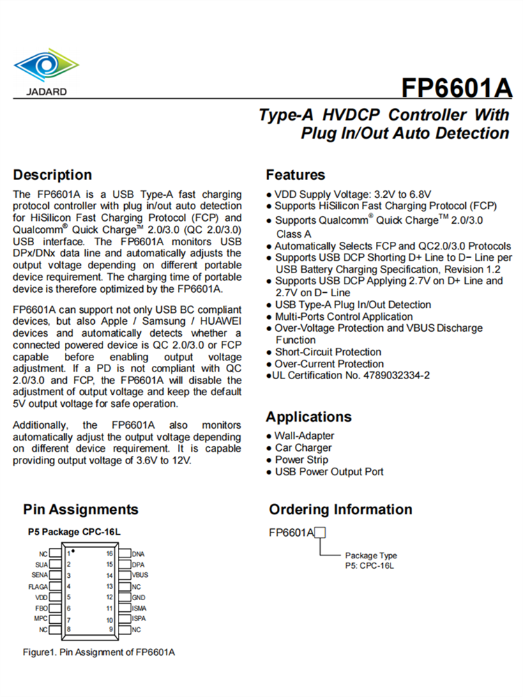天德鈺-FP6601A USB Type-A協(xié)議控制器 CPC-16L