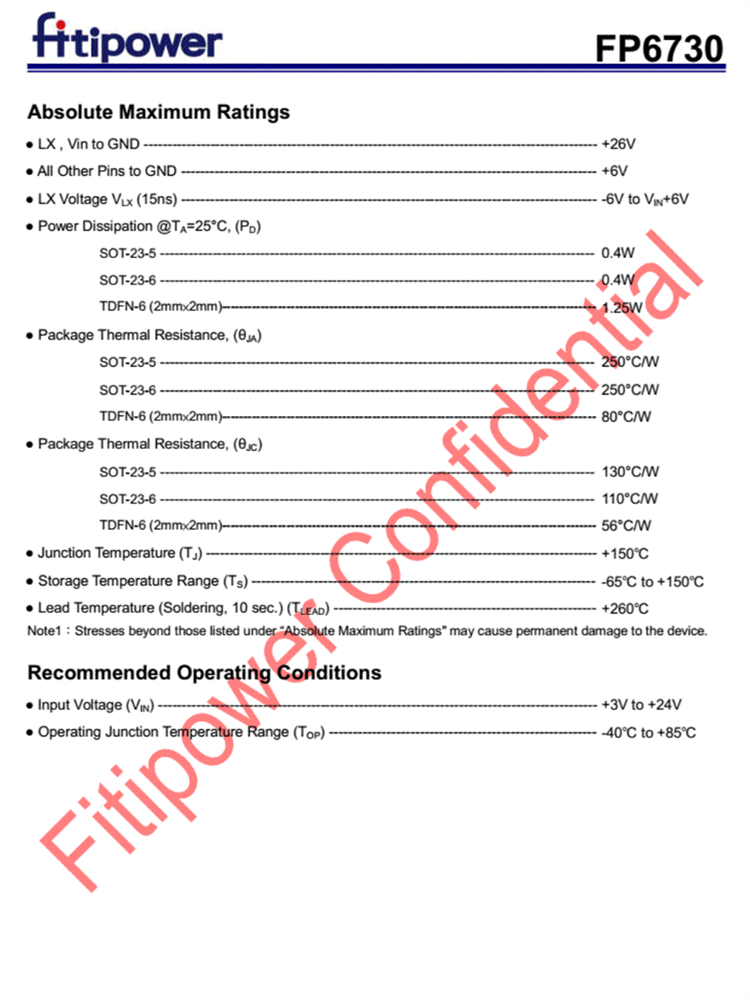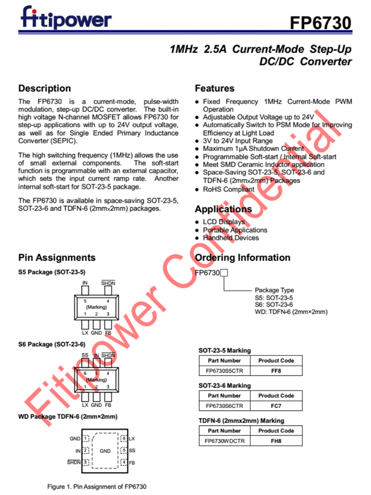 FP6730 采用節省空間的 SOT-23-5、SOT-23-6 和 TDFN-6 (2mm x 2mm) 封裝。