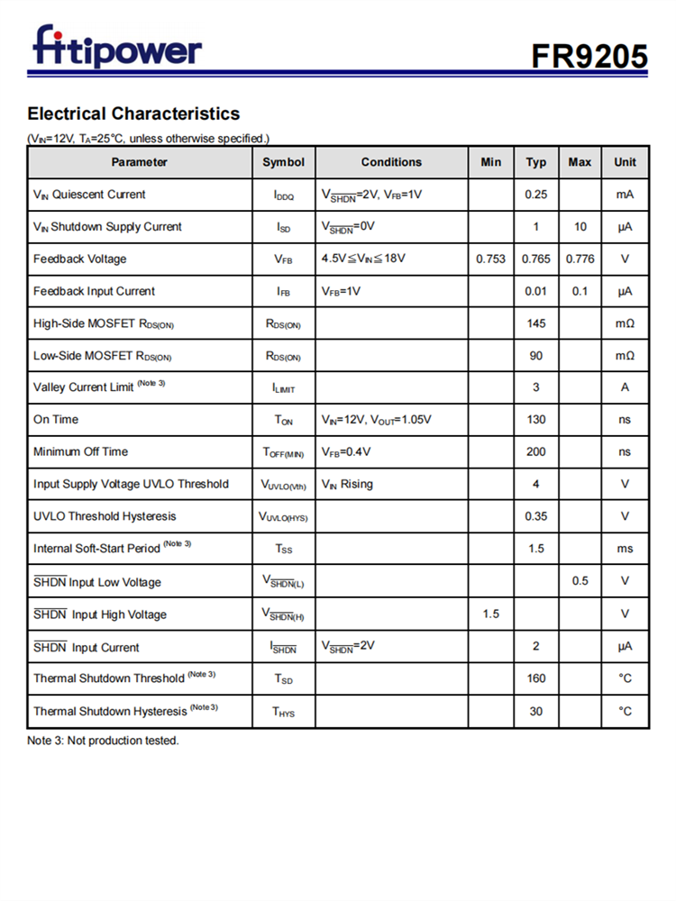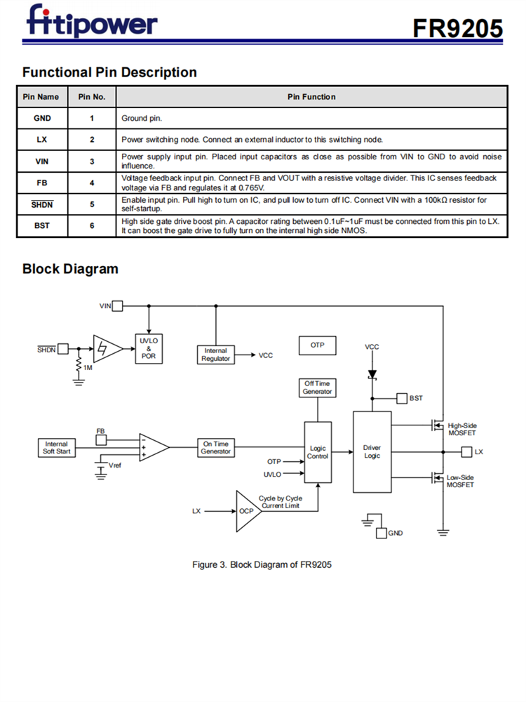 FR9205故障保護包括逐循環電流限制、短路保護、UVLO和熱停機。軟啟動功能防止開啟時涌電流。FR9205使用快速常數的時間控制,提供快速的瞬態響應,抗噪聲性和各種非常低的ESR輸出電容器,以確保性能穩定。