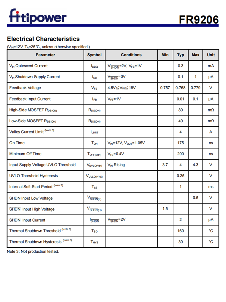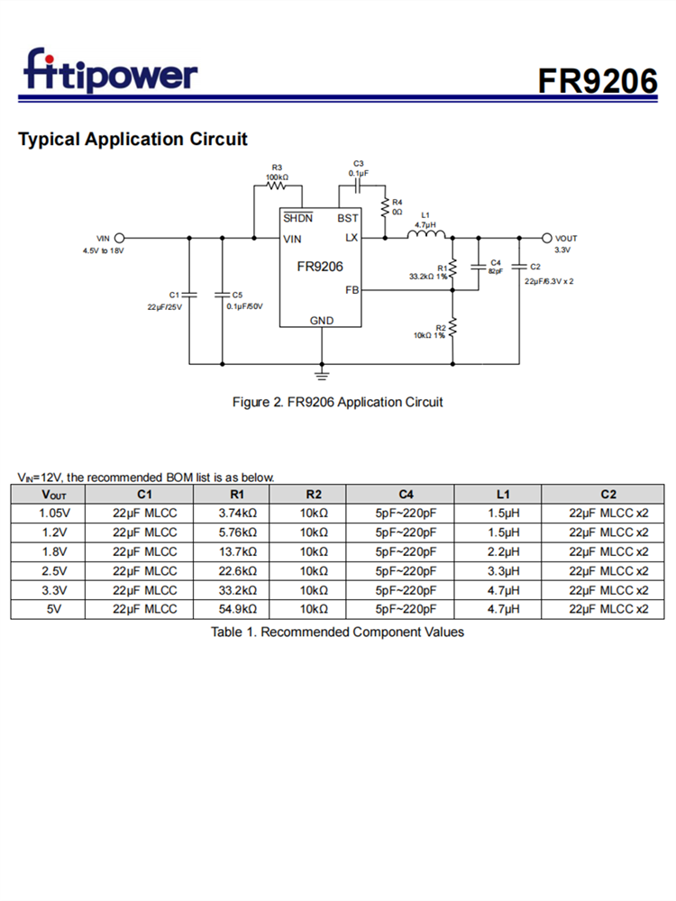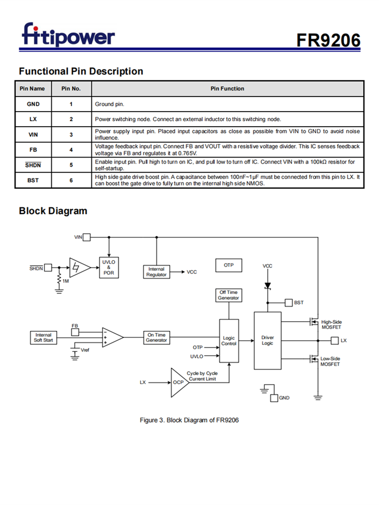 FR9206故障保護包括逐循環電流限制、短路保護、UVLO和熱停機。軟啟動功能防止開啟時涌電流。FR9206使用快速常數的時間控制,提供快速的瞬態響應,抗噪聲性和各種非常低的ESR輸出電容器,以確保性能穩定。