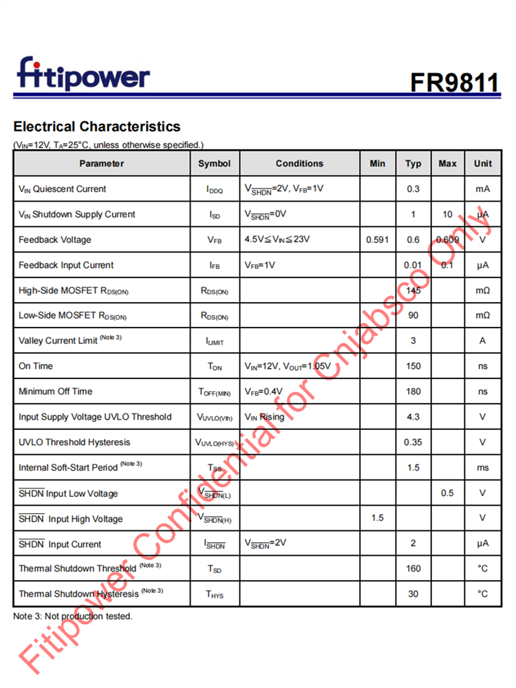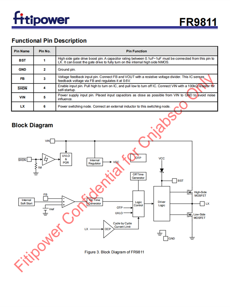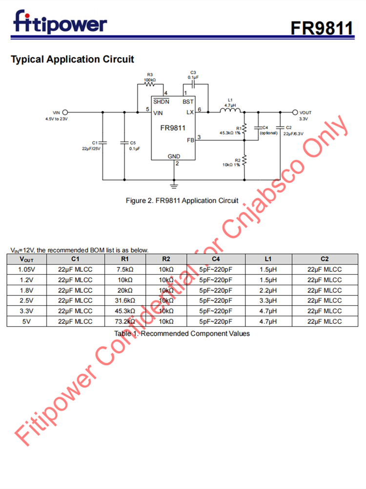 FR9811故障保護包括逐循環電流限制、短路保護、UVLO和熱停機。軟啟動功能防止開啟時涌電流。FR9811使用快速常數的時間控制,提供快速的瞬態響應,抗噪聲性和各種非常低的ESR輸出電容器,以確保性能穩定。