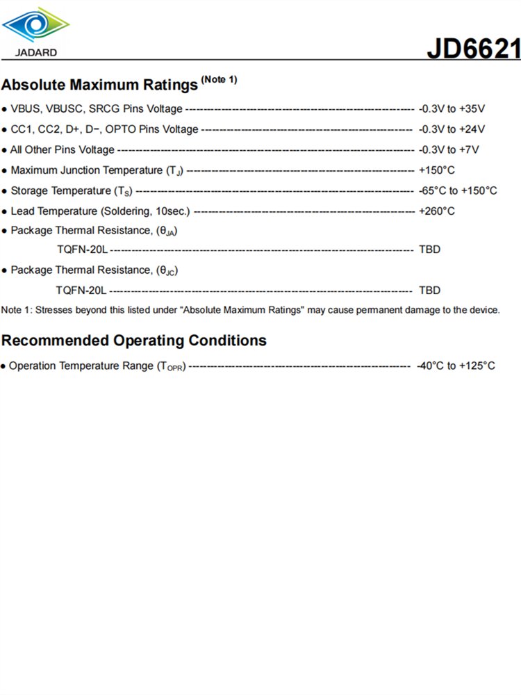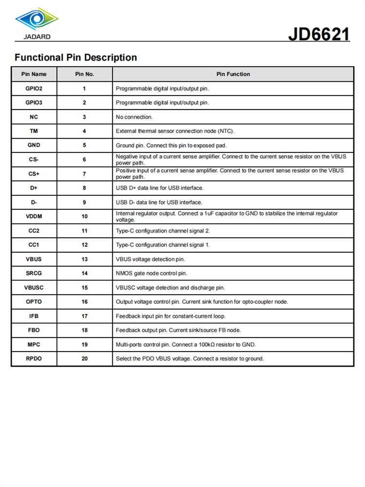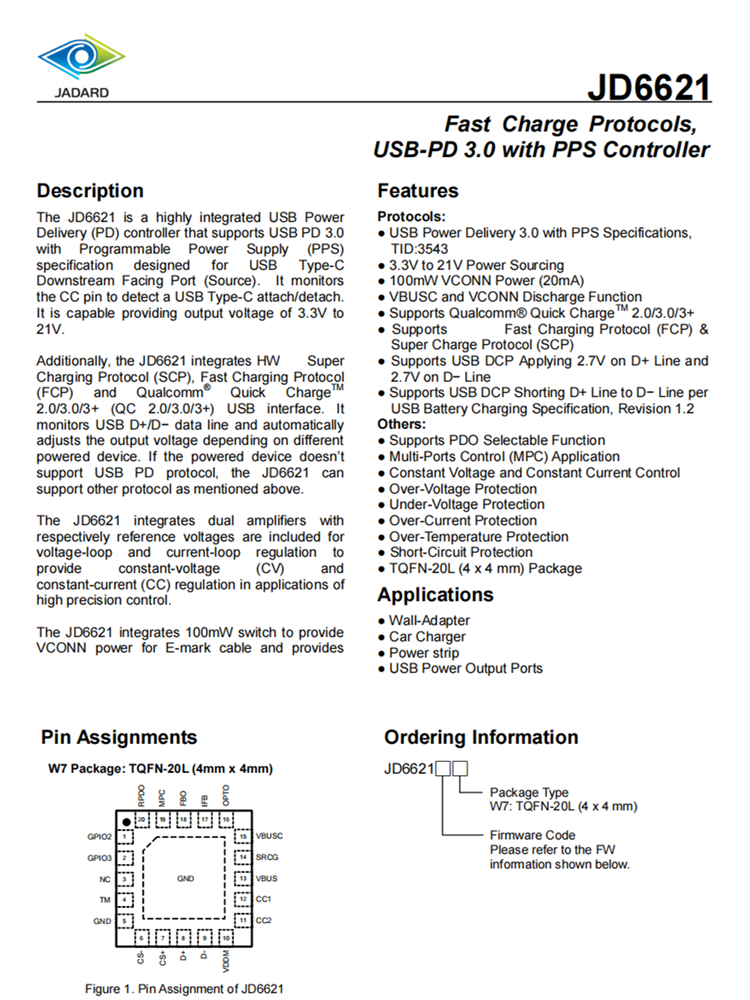 JD6621是一個高度集成的USB電源傳輸(PD)控制器,支持USB PD 3.0與可編程電源(PPS)規范,為USB Type-C下行端口(源)設計。它監控CC大頭針,以檢測USBC型連接/分離。它能夠提供3.3V至21V的輸出電壓。