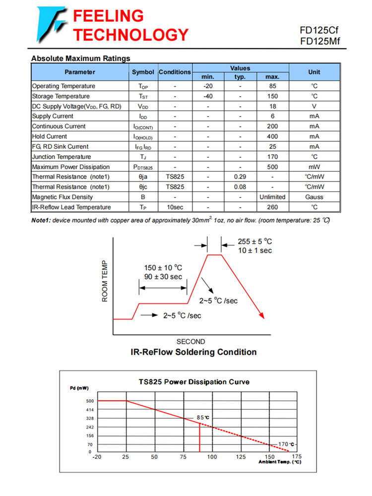 FD125Cf/FD125Mf是一種嵌入式霍爾效應傳感器IC的單相全波電機驅動器。它集成了h橋MOS驅動程序,高靈敏度大廳效應傳感器,一個事件計時器轉子鎖定,轉速表或報警輸出邏輯僅在TS825包,使電機的多氯聯苯(印刷電路板)設計簡單和制造小型直流電機或風扇盡可能簡單。