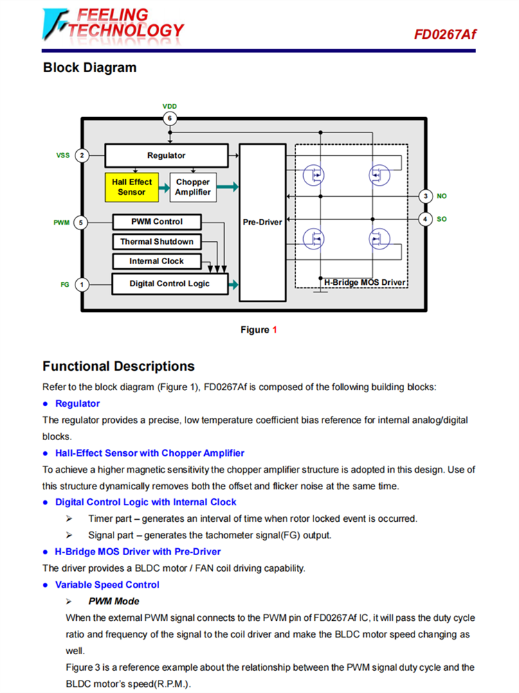該IC包含PWM直接輸入變速控制和轉(zhuǎn)速表信號(FG)輸出功能,外部后續(xù)系統(tǒng)可以控制BLDC電機的轉(zhuǎn)速,并從FD0267Af IC的信號引腳讀出BLDC電機的轉(zhuǎn)速(FG)。