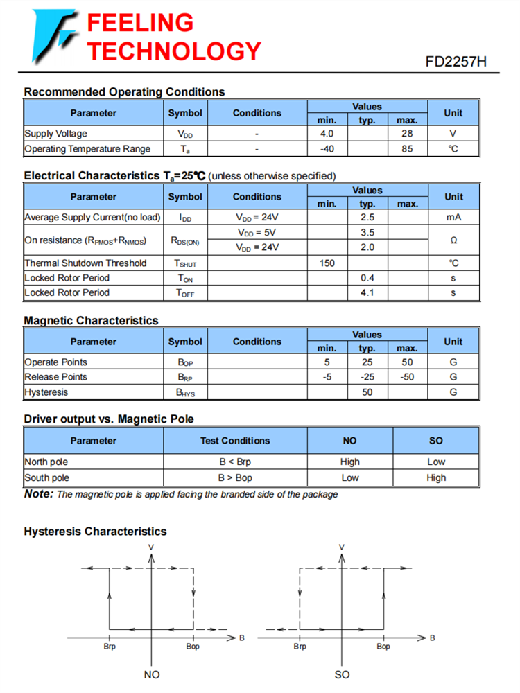 FD2257H是一種嵌入式霍爾效應傳感器IC的單相全波電機驅動器。它集成了h橋MOS驅動器、高靈敏度霍爾效應傳感器、鎖定在SIP-4L封裝中的轉子事件計時器,使電機的多氯聯苯(印刷電路板)設計簡單,制造高效高壓直流電機或fan盡可能簡單。