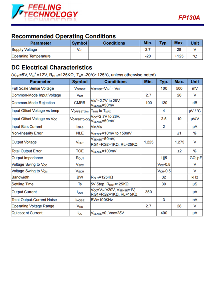 FP130A是一種寬共模范圍高側(cè)軌電流測(cè)量IC。它適用于電源系統(tǒng),如電池充電器或開(kāi)關(guān)電源的應(yīng)用。它包括一個(gè)差分輸入放大器和一個(gè)具有發(fā)射極輸出的NPN晶體管。有三個(gè)外部電阻,軌道電流信號(hào)可以很容易地轉(zhuǎn)換為IC輸出引腳的放大電壓信號(hào)。此外,還可以通過(guò)改變這三個(gè)外部電阻器的值來(lái)調(diào)整增益。
