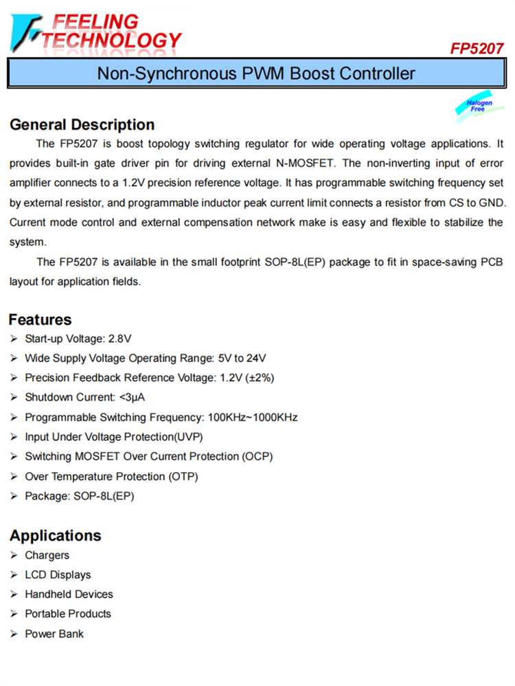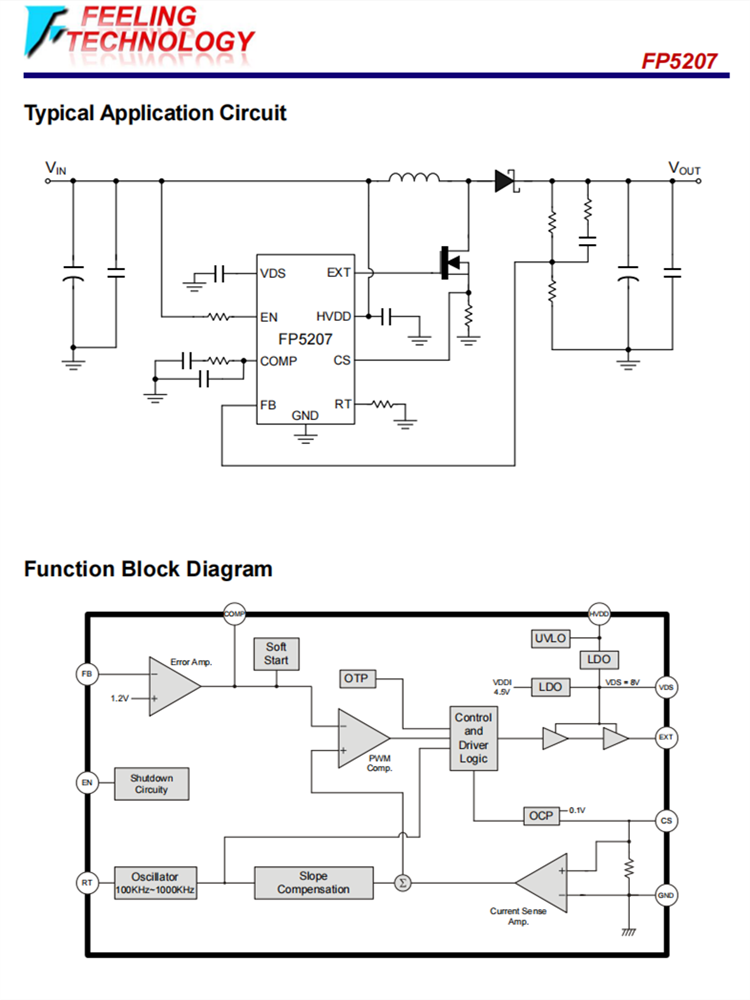 FP5207是用于廣泛工作電壓應用的升壓拓撲開關調節器。它提供了內置的門驅動銷,用于驅動外部N-MOSFET。誤差放大器的非反相輸入連接到一個1.2V的精度參考電壓。它具有由外部電阻器設置的可編程開關頻率,并且可編程電感器的峰值電流極限將電阻器從CS連接到GND。電流模式控制和外部補償網絡使系統穩定簡單靈活。