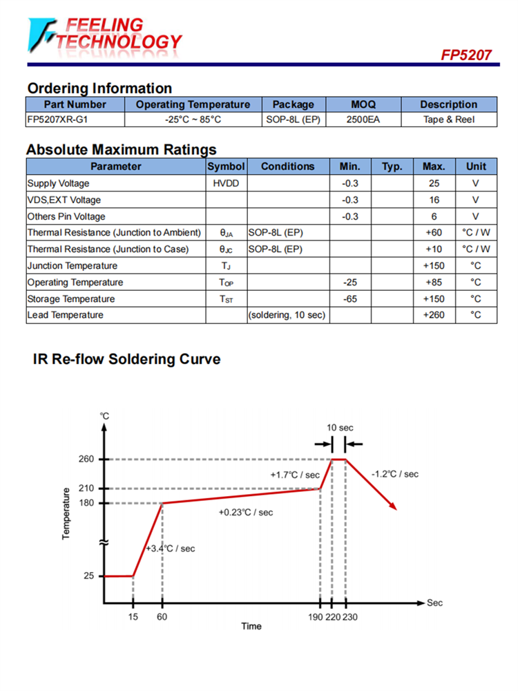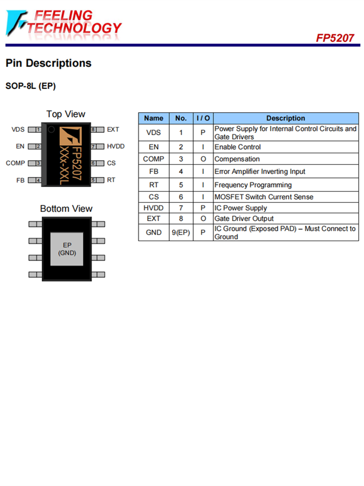 FP5207可在小占用空間的SOP-8L(EP)包中使用,以適合為應用領域節省空間的PCB布局。
