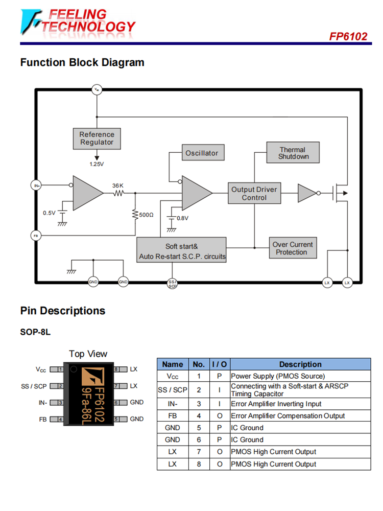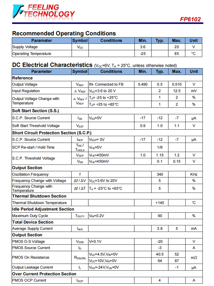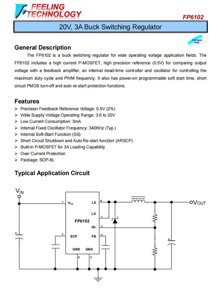 FP6102是一種用于廣泛工作電壓應用領域的降壓開關調節器。FP6102包括高電流P-MOSFET,用于將輸出電壓與反饋放大器進行比較的高精度參考(0.5V),內部死時間控制器和用于控制最大占空比和PWM頻率的振蕩器。它還具有開機可編程軟啟動時間、短路PMOS關閉和自動重新啟動保護功能。