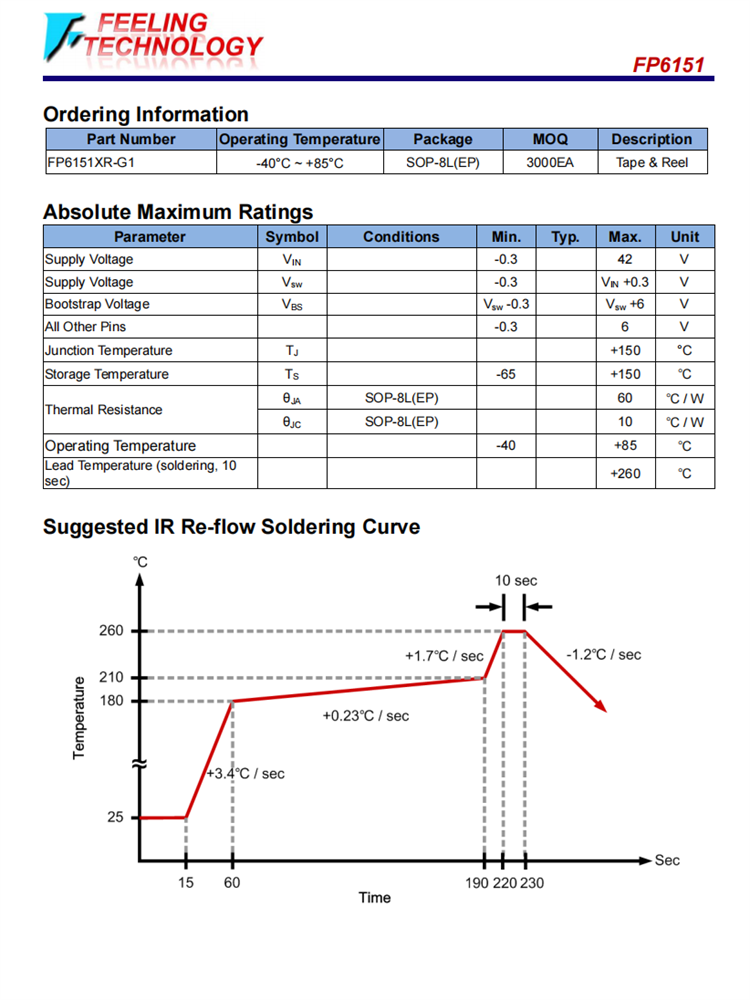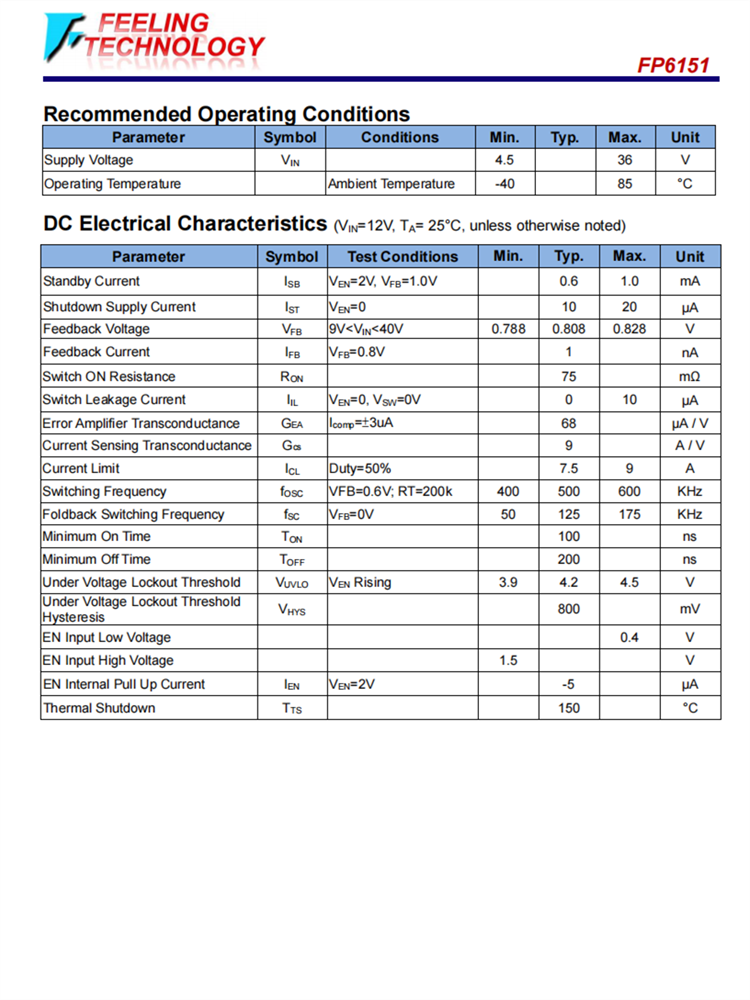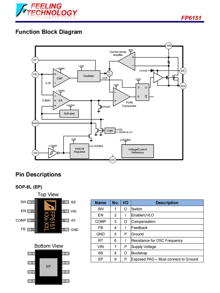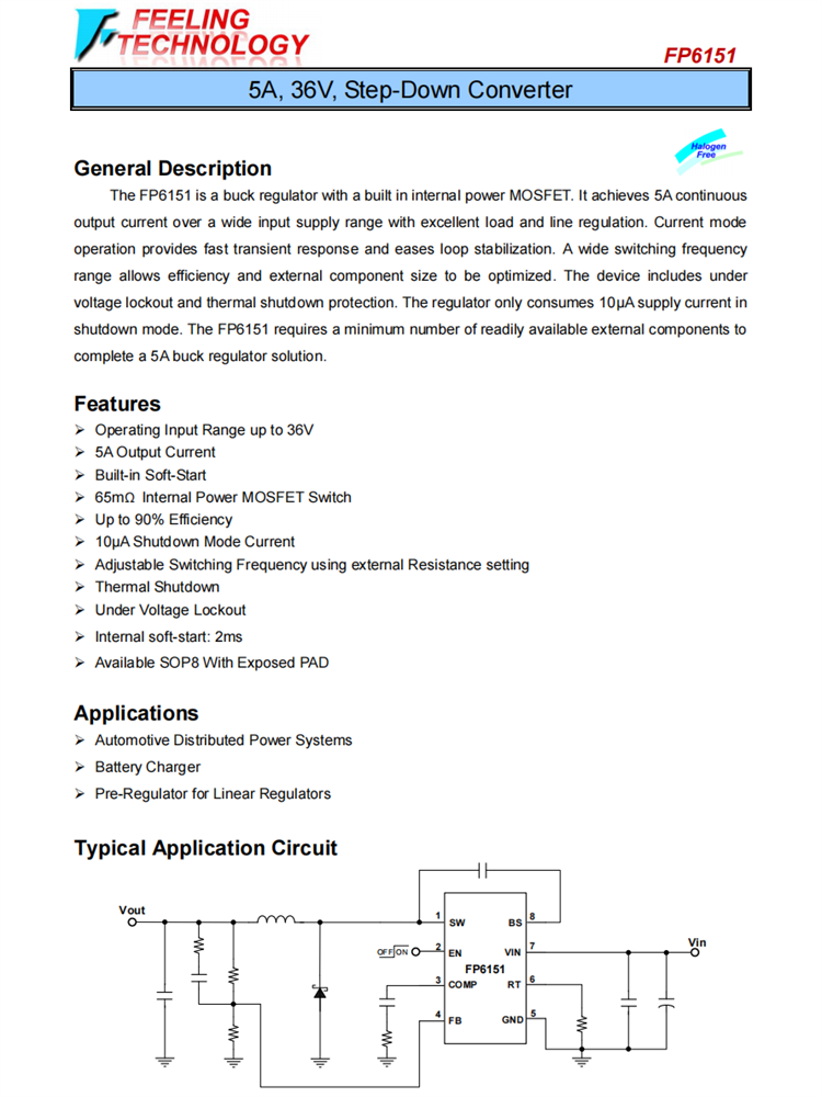 FP6151是一個內置內部功率MOSFET。它在廣泛的輸入電源范圍內實現5A連續輸出電流,具有良好的負載和線路調節。電流模式的操作提供了快速的瞬態響應和簡化的回路穩定。一個較寬的開關頻率范圍允許效率和外部組件尺寸的優化。該裝置包括欠電壓鎖定和熱停機保護。調節器在關閉模式下只消耗10μA的電源電流。FP6151需要最少數量的現成的外部組件來完成一個5A降壓調節器解決方案。