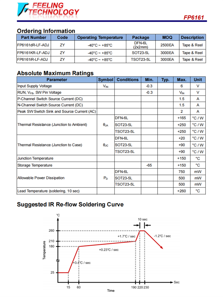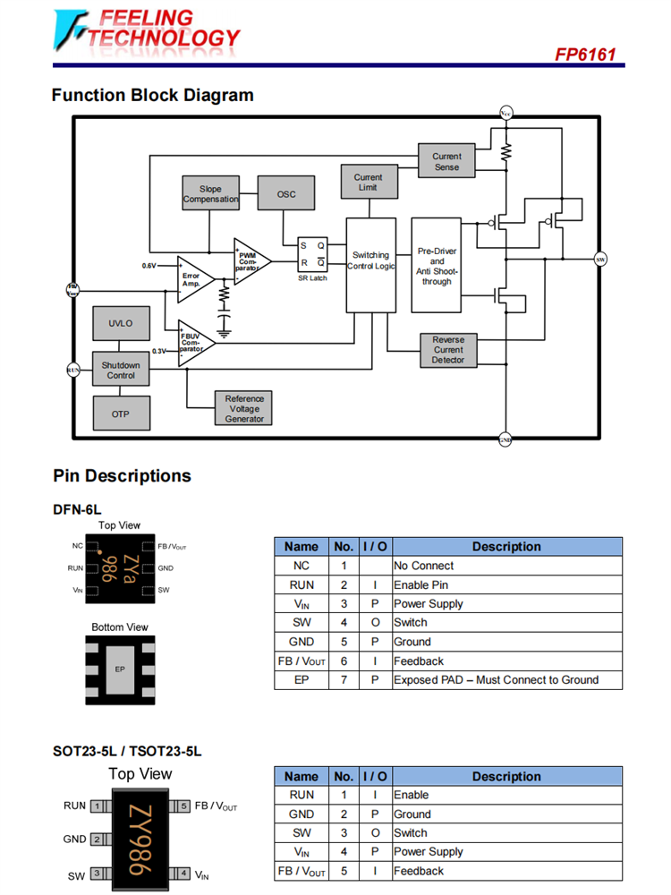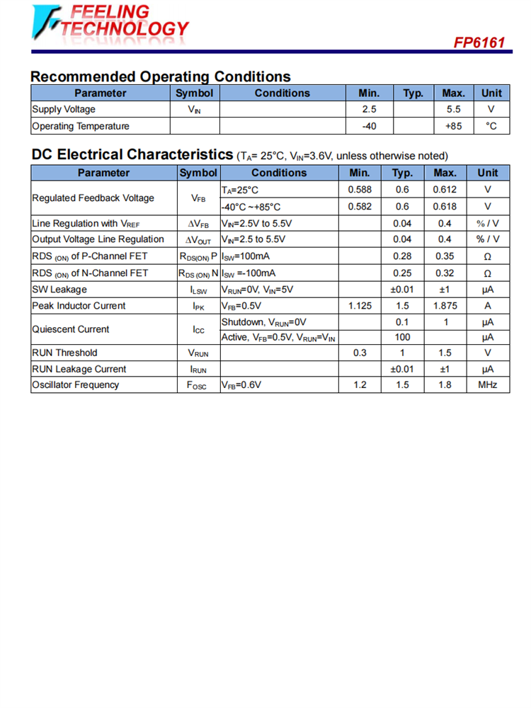 FP6161是一種高效電流模式同步降壓PWM DC-直流調節器。內部產生的0.6V精度反饋參考電壓被設計用于低輸出電壓。低RDS(ON)同步開關可顯著降低導電損耗。為了延長便攜式應用程序的電池壽命,低損耗操作支持100%的占空比。關閉模式還有助于節省當前的消耗。FP6161封裝在DFN-6L、SOT23-5L和TSOT23-5L中,以減少PCB空間。