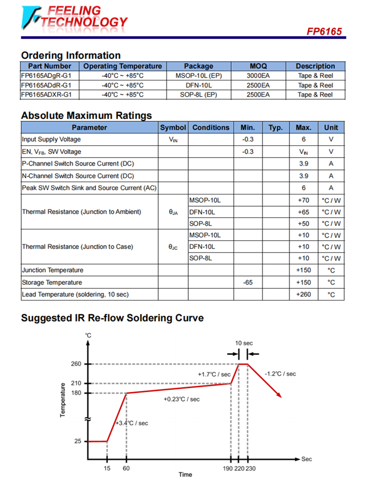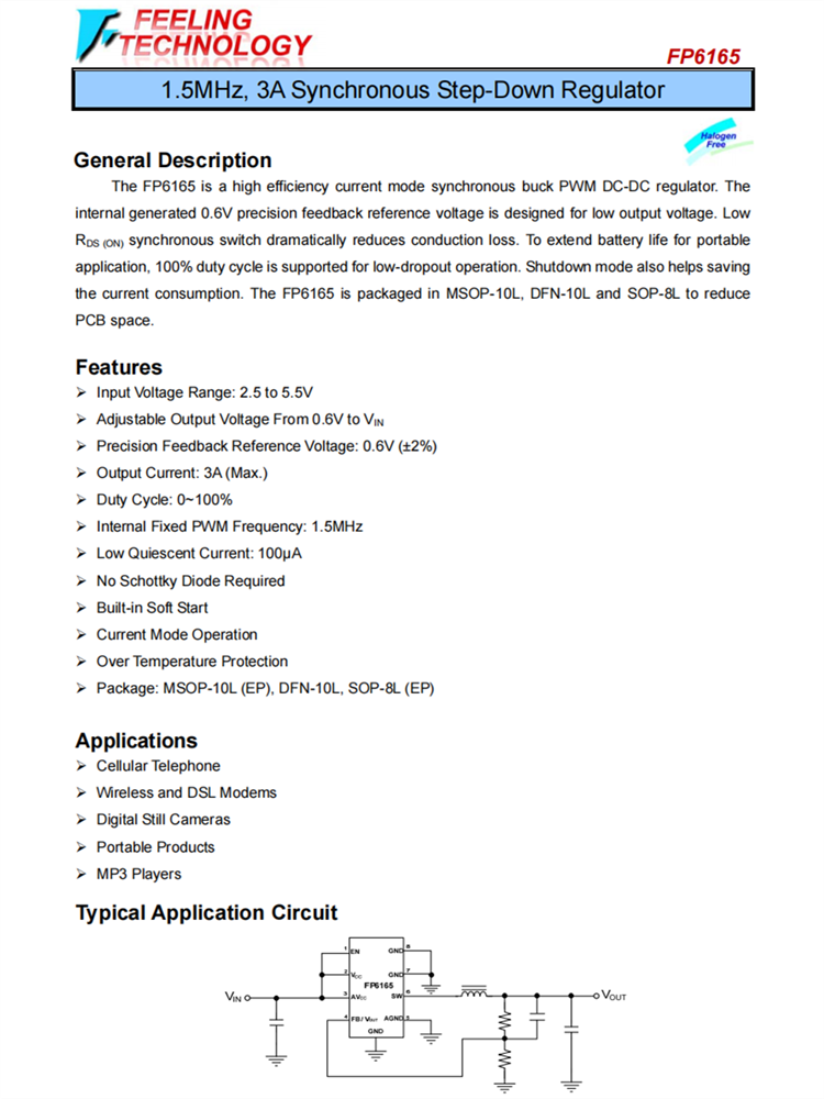 FP6165是一種高效電流模式同步降壓PWM DC-直流調節器。內部產生的0.6V精度反饋參考電壓被設計用于低輸出電壓。低RDS(ON)同步開關可顯著降低導電損耗。為了延長便攜式應用程序的電池壽命,低損耗操作支持100%的占空比。關閉模式還有助于節省當前的消耗。FP6165采用MSOP-10L、DFN-10L和SOP-8L,以減少PCB空間。