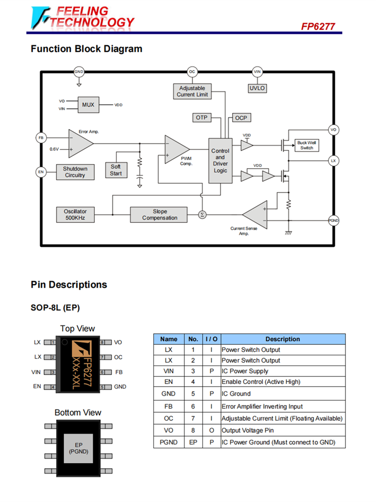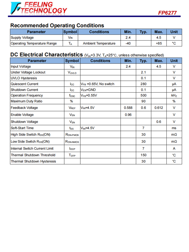 FP6277是一個電流模式升壓直流與PWM/PSM控制轉換器。它的PWM電路內置30mΩ高側開關和30mΩ低側開關使該調節器高高效。內部補償網絡還將外部組件計數最小化到只有6個。一個內部的0.6V電壓被連接到誤差放大器的非反相輸入作為精度參考電壓。內置軟啟動功能,可以減少涌入電流。