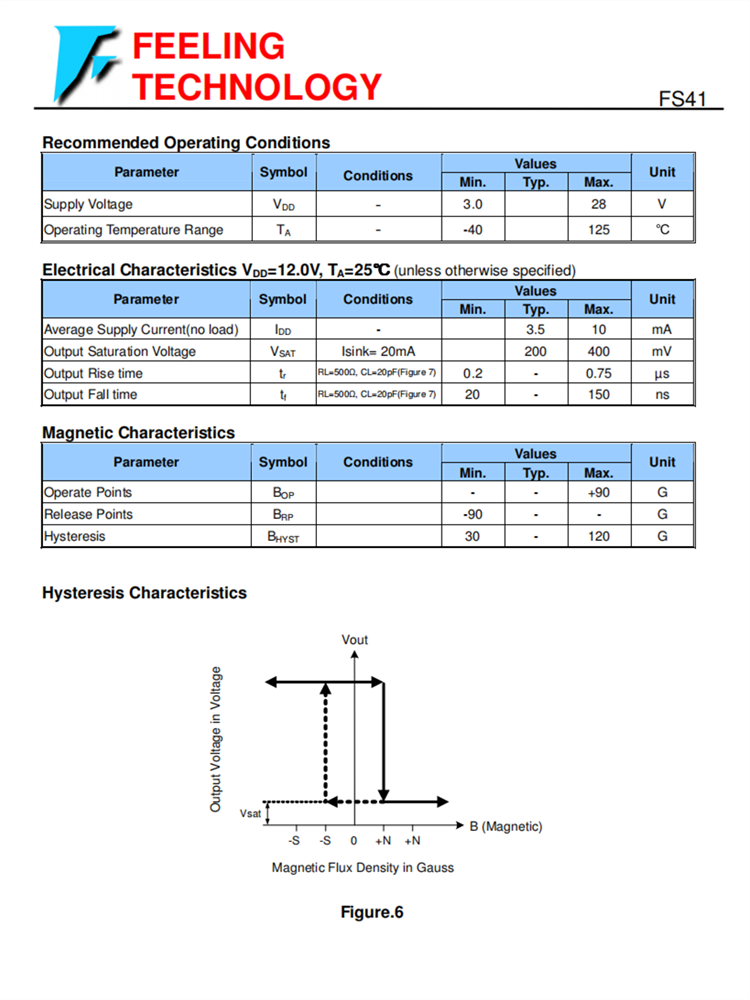 FS41是一個集成的霍爾效應鎖存傳感器,設計用于無刷直流電機應用的電子換向器。該設備包括一個用于磁傳感的片上霍爾電壓發生器,一個放大霍爾電壓的比較器,以及一個用于為噪聲抑制提供開關滯后的施密特觸發器,以及開集電極輸出。一個內部帶隙調節器用于為內部電路提供溫度補償的電源電壓,并允許一個廣泛的工作電源范圍。