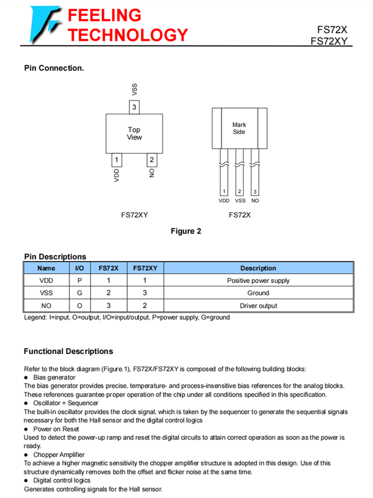 FS72X/FS72XY是一個具有鎖存數字輸出的霍爾傳感器。它適用于無刷直流電機的電子換向應用。FS72X/FS72XY使用斬波器放大器進行磁信號放大,這可以實現低偏移量,從而實現精確的磁開關閾值。