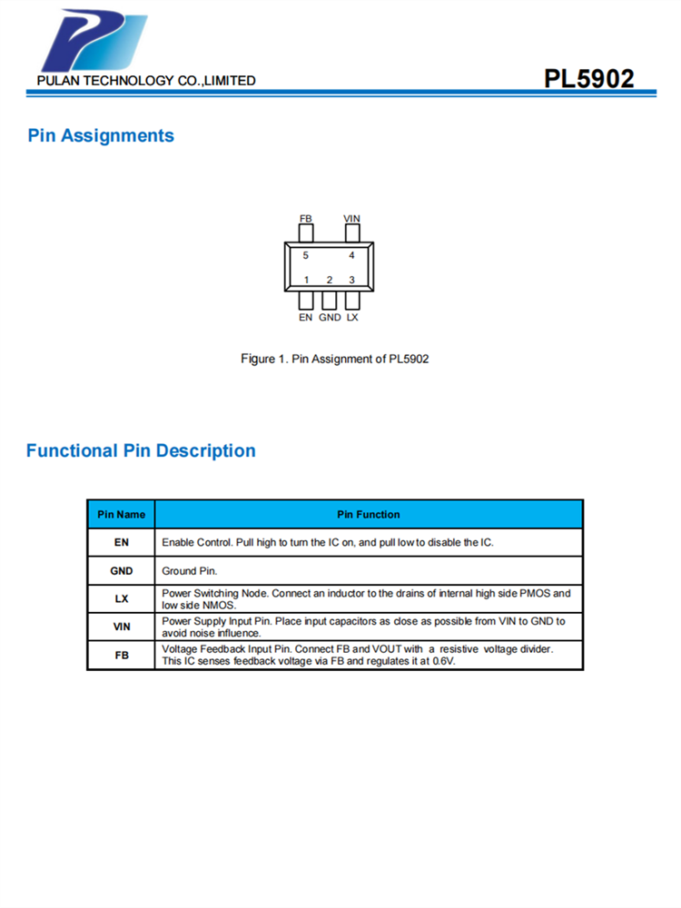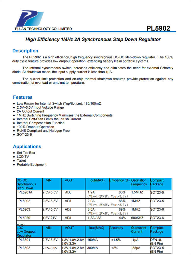 PL5902是一種高效、高頻同步DC-DC降壓調節器。100%占空比功能提供了低退出操作,延長了便攜式系統的電池壽命。