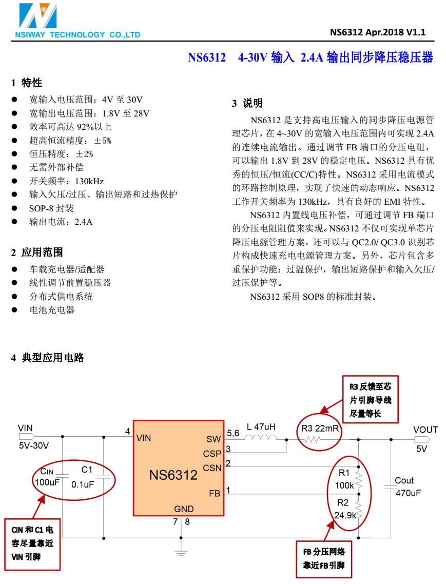 4V~30V輸入電壓范圍,占空比100%,輸出電流2.4A同步整流降壓IC -NS6312