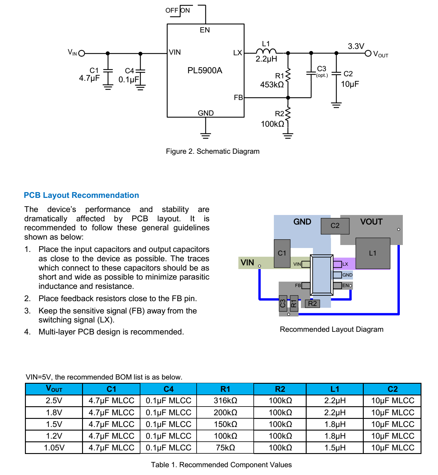 PL5900A開關頻率內部設置為 1.5MHz, 允許使用小的表面安裝電感和電容器。