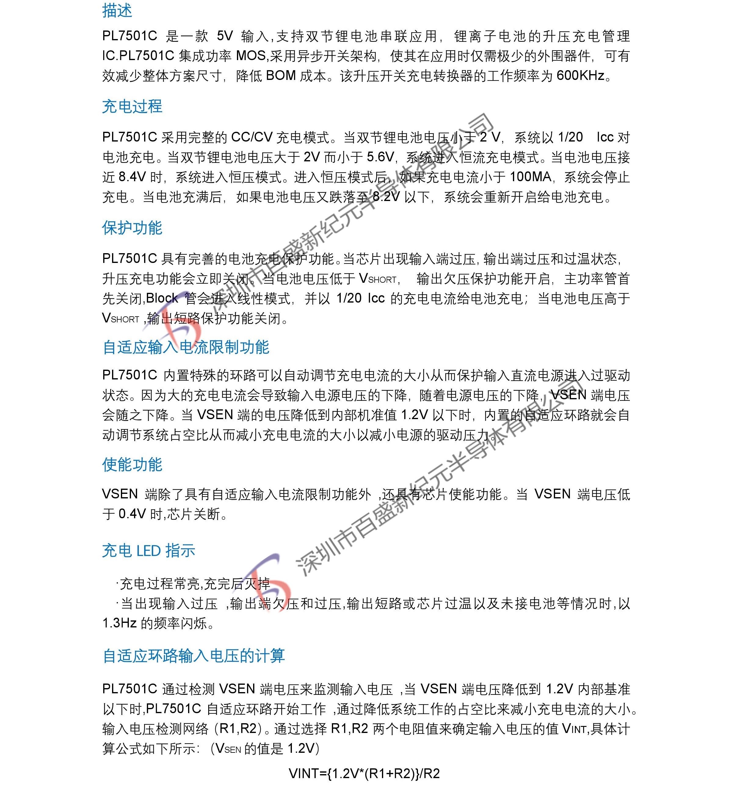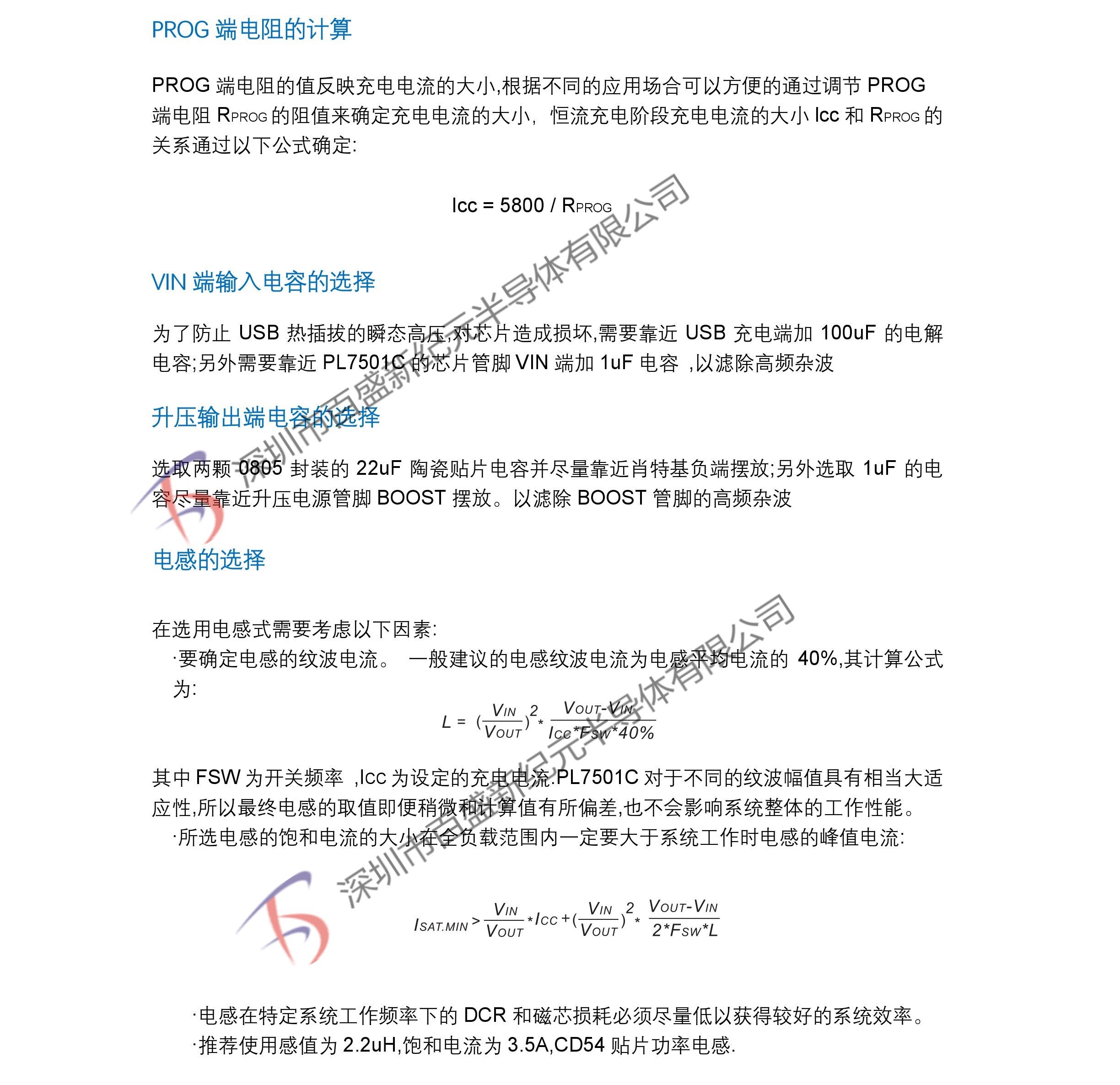 PL7501C 是一款 3.6V-5.5V 輸入, 1A 輸出,雙節鋰電池/鋰離子電池充電的異步升壓充電控制器。具有完善的充電保護功能。針對不同的應用場合,芯片可以通過方便地調節外部電阻的阻值來改變充電電流的大小。針對不同種類的適配器,芯片內置自適應電流調節環路,智能調節充電電流大小,從而防止充電電流過大而拉掛適配器的現象。芯片將功率管內置從而實現較少的外圍器件并節約系統成本。